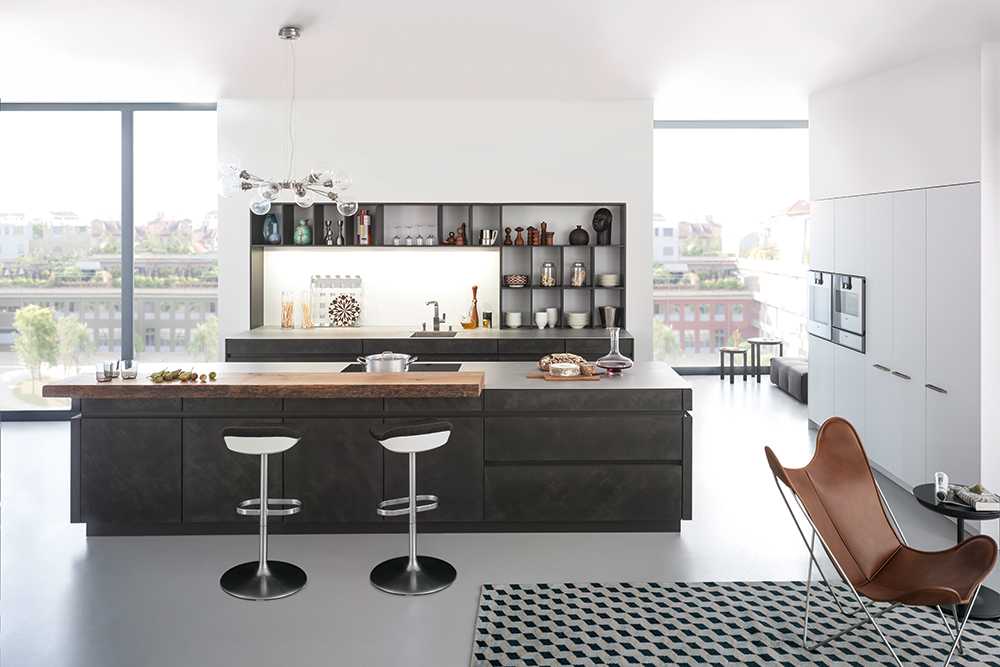 Черный подчеркивает все изъяны и поэтому требует постоянной уборки кухонных принадлежностей и инвентаря для предотвращения беспорядка. В этом поможет функционально продуманная конструкция гарнитура с максимально вместительными ящиками и шкафами.