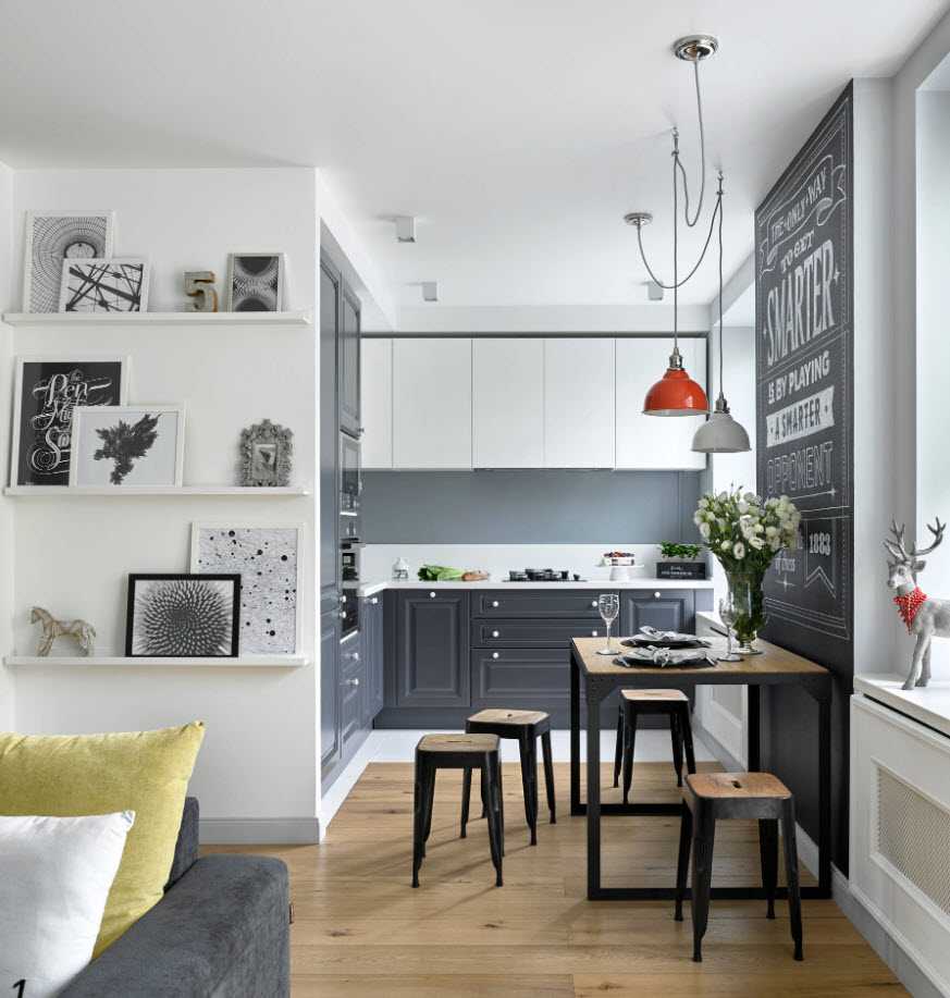 - В интерьере маленькой кухни, например, в хрущевке, черный дизайн кухни вполне уместен, но в меру: если на стене, то только на одной, если в гарнитуре – то только вверху или низу, если на полу – то только на нем и в декоре. На фото ниже пол на кухне-гостиной в хрущевке отделан темной плиткой в тон акцентной стены.