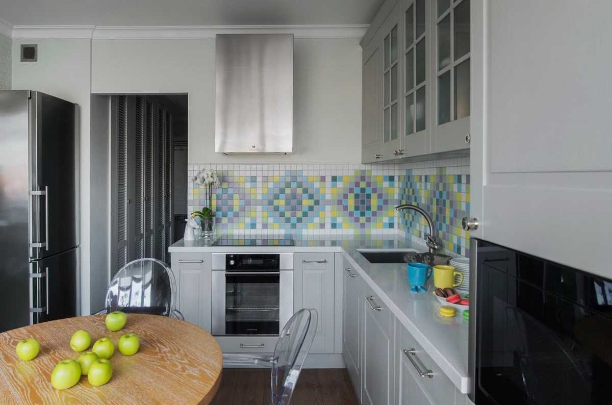 Матовые поверхности фасадов смотрятся более выигрышно, вы сможете их дополнить глянцевыми настенными и напольными материалами. Изюминкой этого интерьера можно считать фрагментарную яркую мозаику.