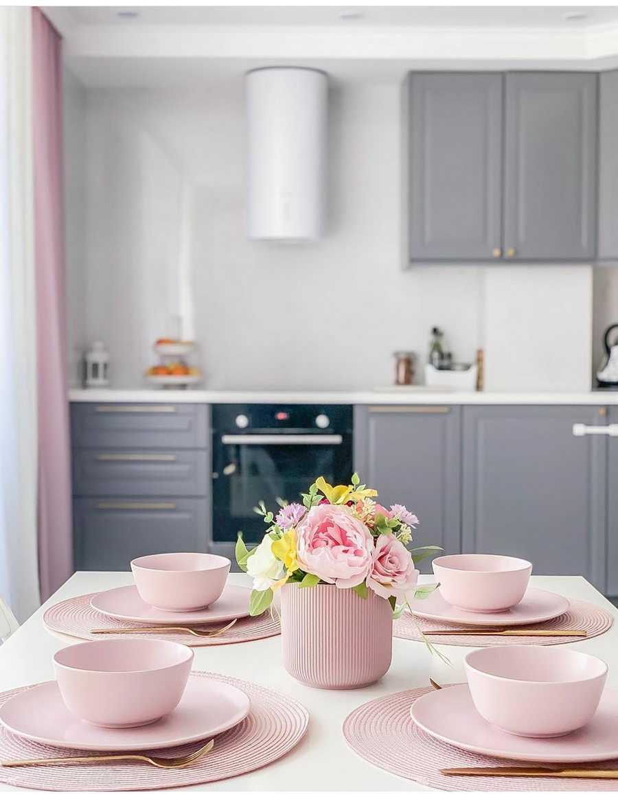 Кухню в розовых красках оформляют не так часто, этот цвет считается девичьим, но ведь нюансов розового множество: от трендового пудрового до фуксии и винно-розового. Это один из самых ненавязчивых и мягких тонов, он улучшает настроение, пробуждает аппетит, снимает агрессию.