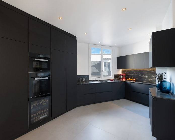 Черный имеет множество оттенков, которые хорошо видны при свете, поэтому перед выбором мебельного гарнитура для кухни стоит определится, будет ли это, например, сине-черный оттенок, черно-фиолетовый или черно-коричневый. Яркие фрукты на столе, насыщенного цвета полотенца, горшочки с зеленью будут удачно подчеркивать благородный тон гарнитура.