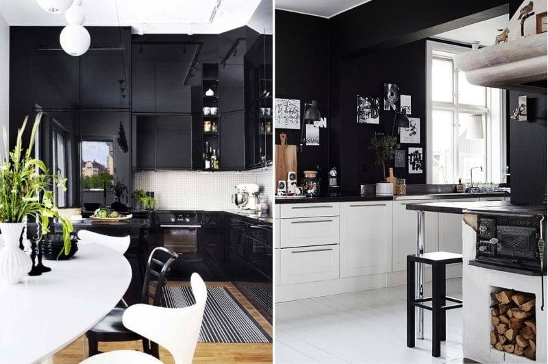 Важную роль играет цвет и материал отделки стен, поэтому необходимо правильно подобрать удачный фон для черного гарнитура. Это могут быть контрастные белые обои или насыщенные яркие тона: красный, желтый, зеленый.