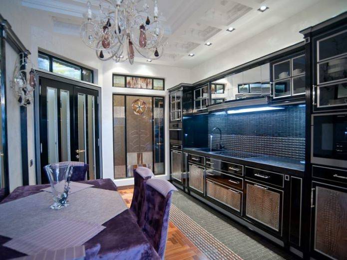 Выгодно подчеркивают мебель хромированные ручки, каменные столешницы и вставки из стекла, деревянный пол в сочетании с благородным черным смотрится презентабельно и стильно. Смягчит и придаст шарм дизайну люстра из хрусталя или стекла.