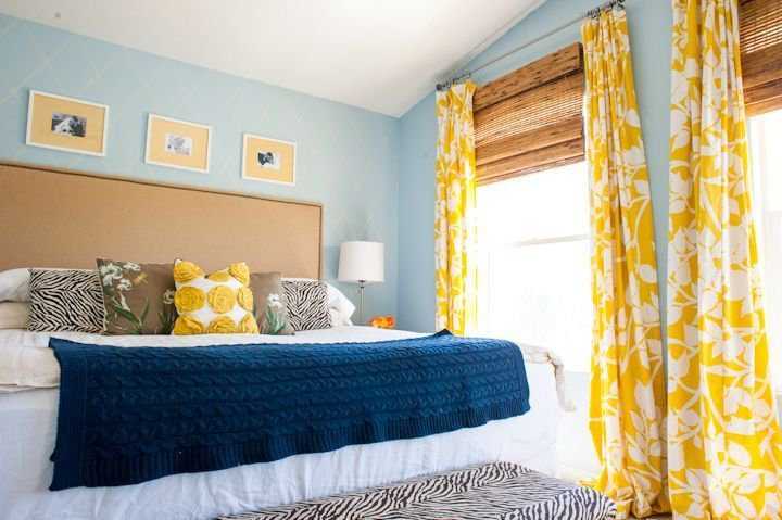 Темные оттенки желтого и синего создают отличный контраст. Причем его лучше всего воплотить в комнате семейной пары, которая страдает от излишней эмоциональности, вспыльчивости