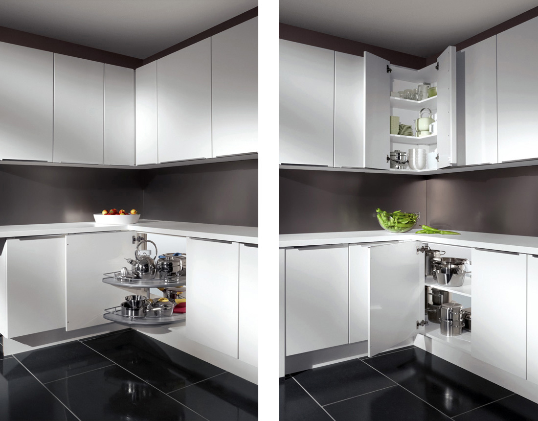 Угловы шкафы делятся на два вида: трапециевидные и Г-образные. Общие параметры совпадают с конструкциями шкафов, прилегающих по обе стороны от угловой.