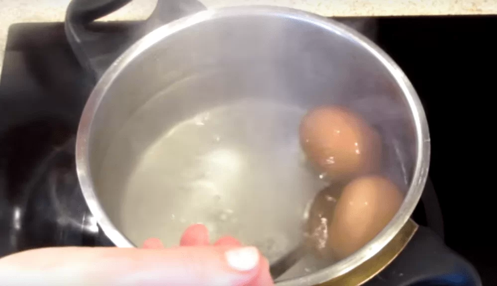 Теперь приготовим куриные яйца. Для этого отправляем их в кипящую, обязательно соленую воду, ровно на одну минуту. Затем извлекаем их из кипятка и опускаем в холодную воду и даем хорошо остыть.