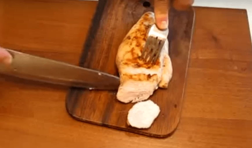 Обжаренное филе режем на произвольные ломтики, обычно небольшие, чтобы было удобно сразу отправлять в рот.