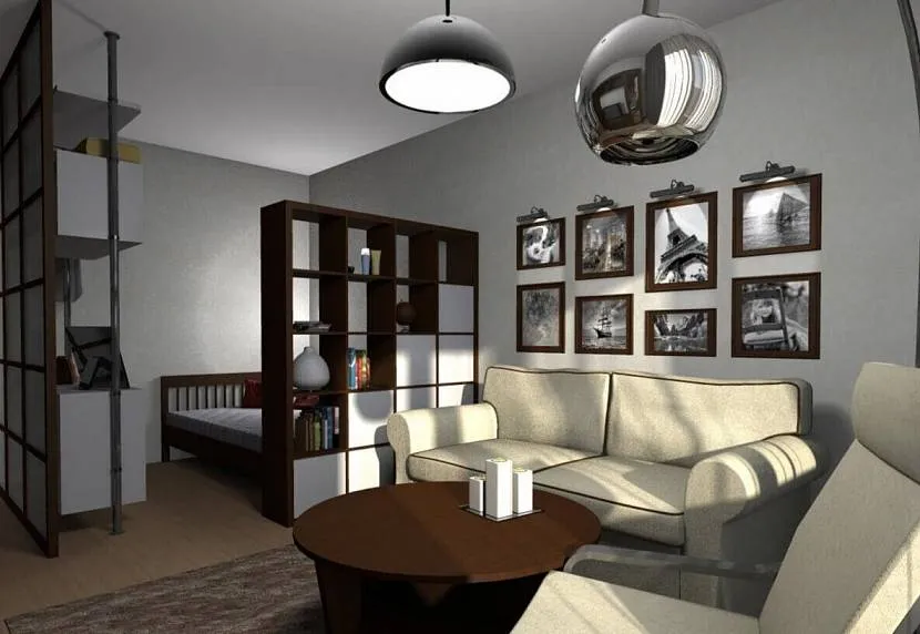Вместо перегородки может быть задействован стеллаж между диваном и кроватьюИсточник berkem.ru
