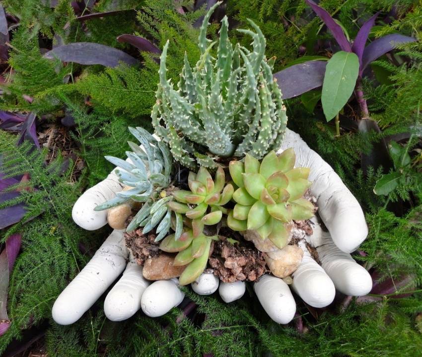 - наполнить землей и высадить внутри цветы можно практически любой ненужный элемент, включая порванные сапоги, керамическую посуду иди мебель.