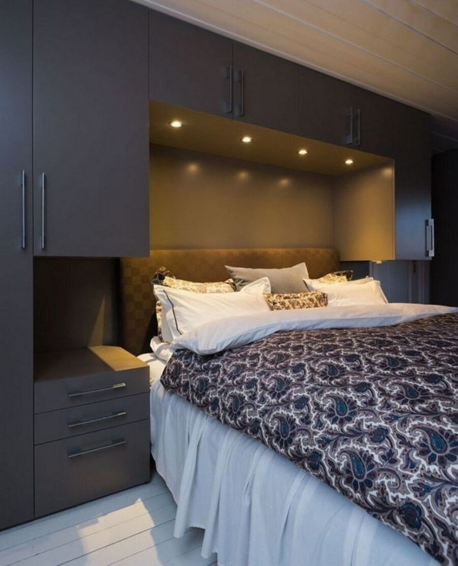 Необходимость шкафа над кроватью в спальне может быть продиктована небольшими размерами комнаты и удобством для хозяев.