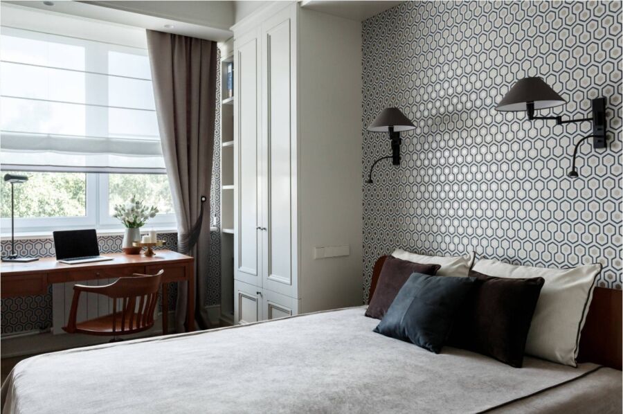 Обратите внимание: в зависимости от выбранного вами стиля нишу под шкафами над изголовьем кровати можно интересно обыграть. Для декорирования этой части стены используют мягкие или 3D-панели из дерева или гипса, покрывают декоративной штукатуркой, оформляют текстильными дорогими обоями. За счет того, что площадь небольшая, можно использовать дорогие и качественные материалы, которые придадут изюминку всей спальне
