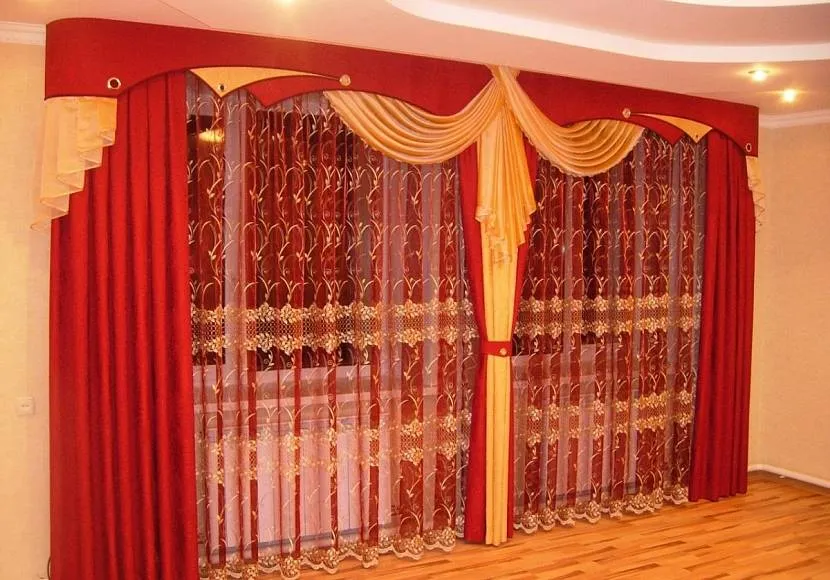 Легкие ламбрекены из вуали смотрятся хорошо в помещениях с высокими потолками. Однако данное правило можно обойти, если смешать легкие ткани с более тяжелыми портьерными. В обстановке гостиной обычно приветствуется, если ламбрекен будет создан из тканей контрастных оттенков.