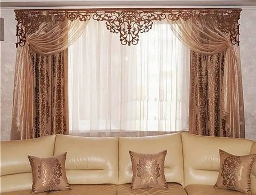 Выбирая дизайн ламбрекена, учитывают общую стилистику гостиной. Рисунок должен сочетаться с узором на текстиле, например диванных подушках или подхватах для штор.