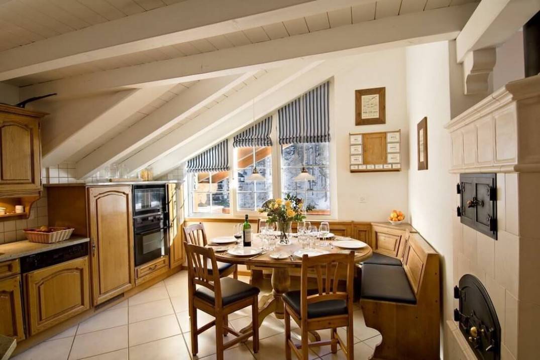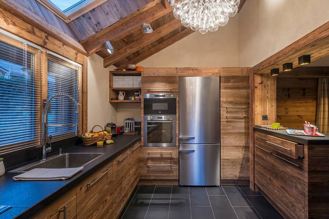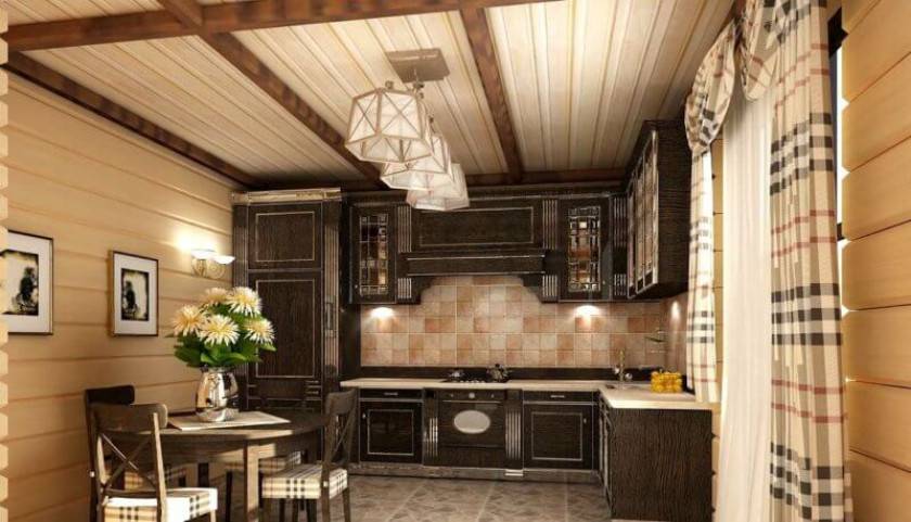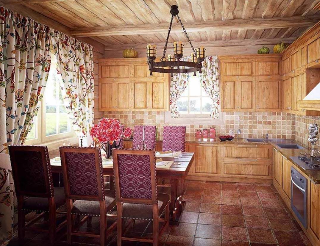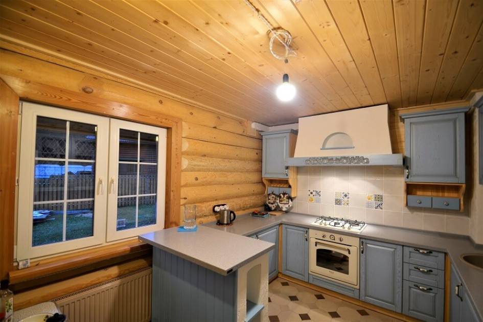 Если под деревянным домом подразумевается дача, на которую семья съезжается только по выходным и праздникам, то кухня может быть и совсем небольшой. Тем более, чаще всего в нашей стране любят готовить на природе — шашлыки или барбекю, а плита используется не так часто.