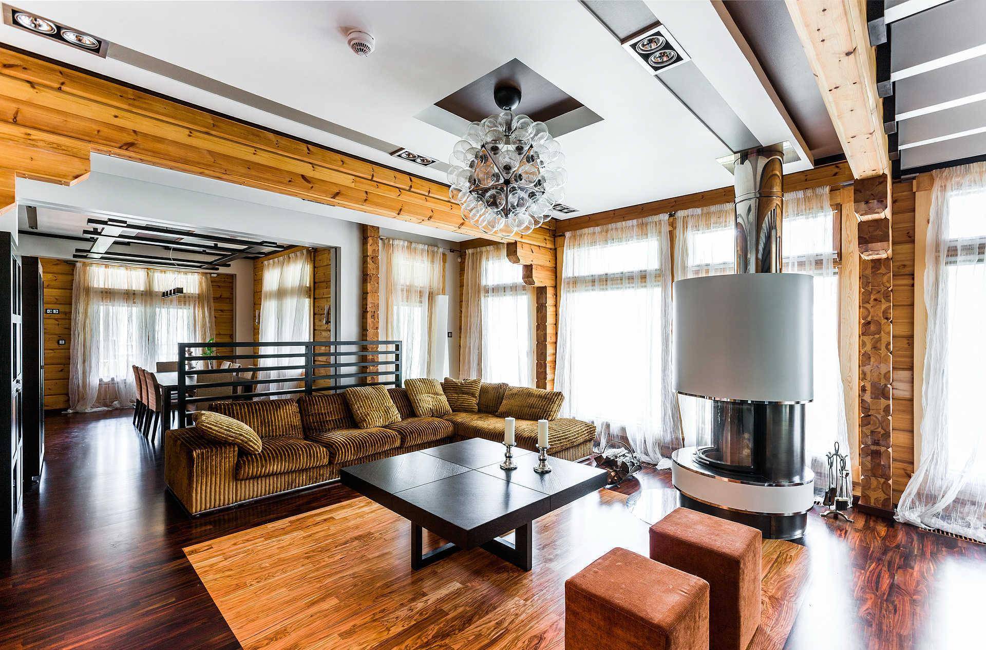 Главной привлекательной чертой жилых домов состоит в мощной осветительной системе, которая будет сочетать естественный свет и большие осветительные приборы, которые выступают в роли функциональных и декоративных элементов. Планировка с высоким потолком визуально помогает расширять пространство, и потому у владельцев второго освещения в деревянном доме появляется ощущение просторной жилой площади даже в случае, когда вся территория не больше 150 квадратных метров. Отсутствие лишних перегородок на первом этаже дает возможность осуществить зонирование, а интерьерные предметы подстраиваются под нужды владельцев – обеденный стол легко передвигать в зону для отдыха, в процесс готовки пищи совмещать с простором телевизора.
