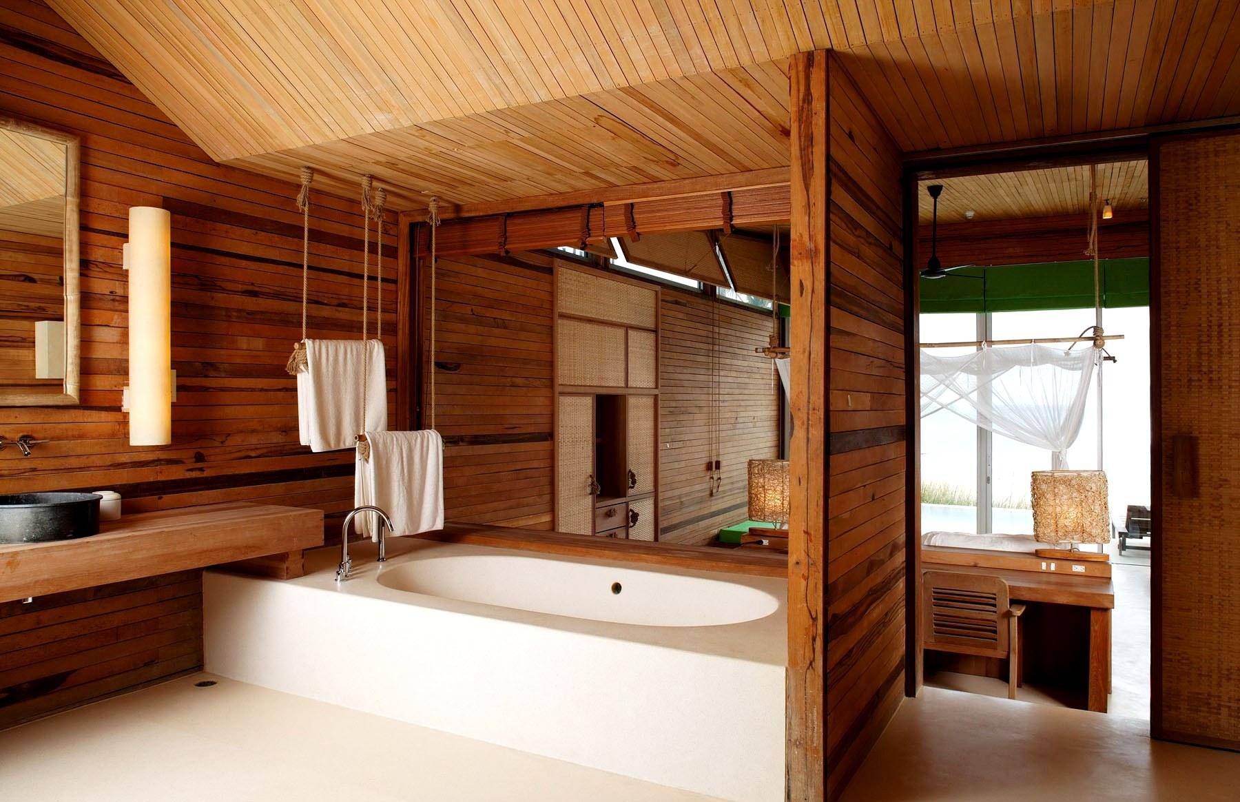 На пол кладут плитку, поскольку только она обладает достаточно низкой чувствительностью к перепадам температуры и влажности, на стены — пластиковые панели или ту же плитку. Шторку для ванной лучше брать не из целлофана, а на пол лучше постелить коврик, чтобы не мерзли ноги.