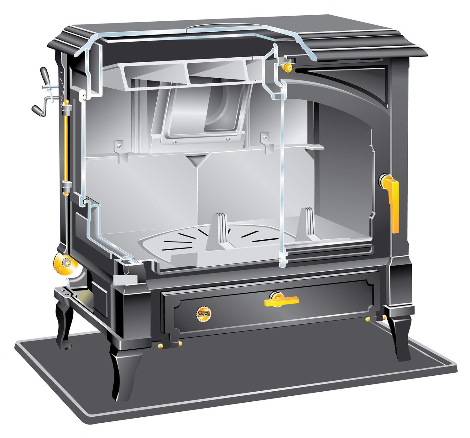 - В печке устроена вторичная камера сгорания, где происходит дожигание горючих (пиролизных) газов, выделяющихся при тлении древесины. В эту камеру отдельно подается воздух, прогретый в основной топке.