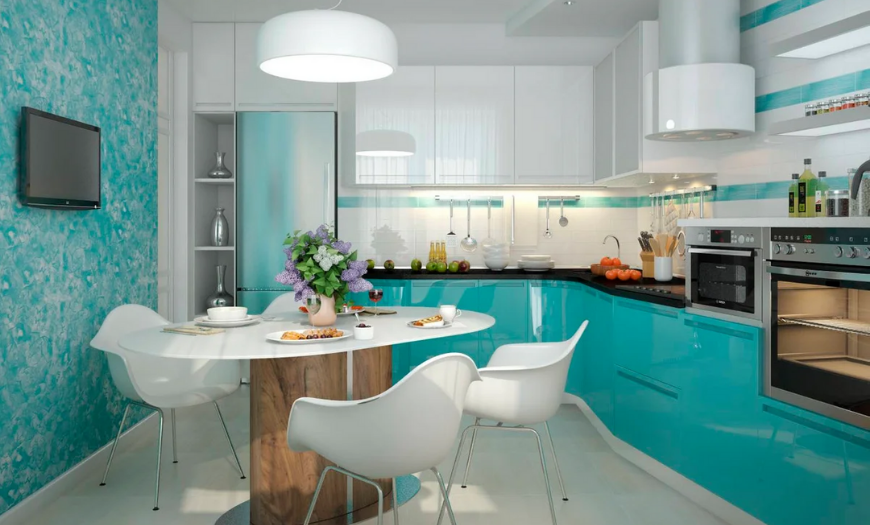 Если же речь идет о просторной кухне или кухне-студии, ограничений в цвете практически нет, но все равно лучше придерживаться идей зонирования и распределять цвета согласно определенным зонам.