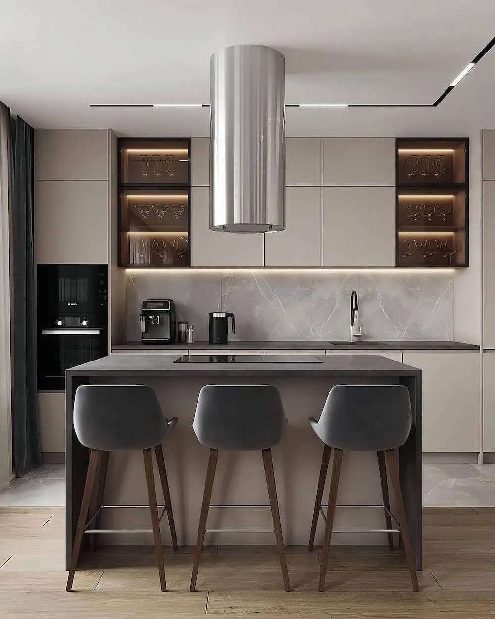 Минимализм по-прежнему находится на пике популярности. Его девиз: «Ничего лишнего». Минимум аксессуаров и максимум функциональности. Его цвета — белый, серый и черный. Это разбавляется яркими акцентами и тщательно продуманным освещением. Потолки в кухнях часто делают многоуровневыми, добавляя помещению креативности.