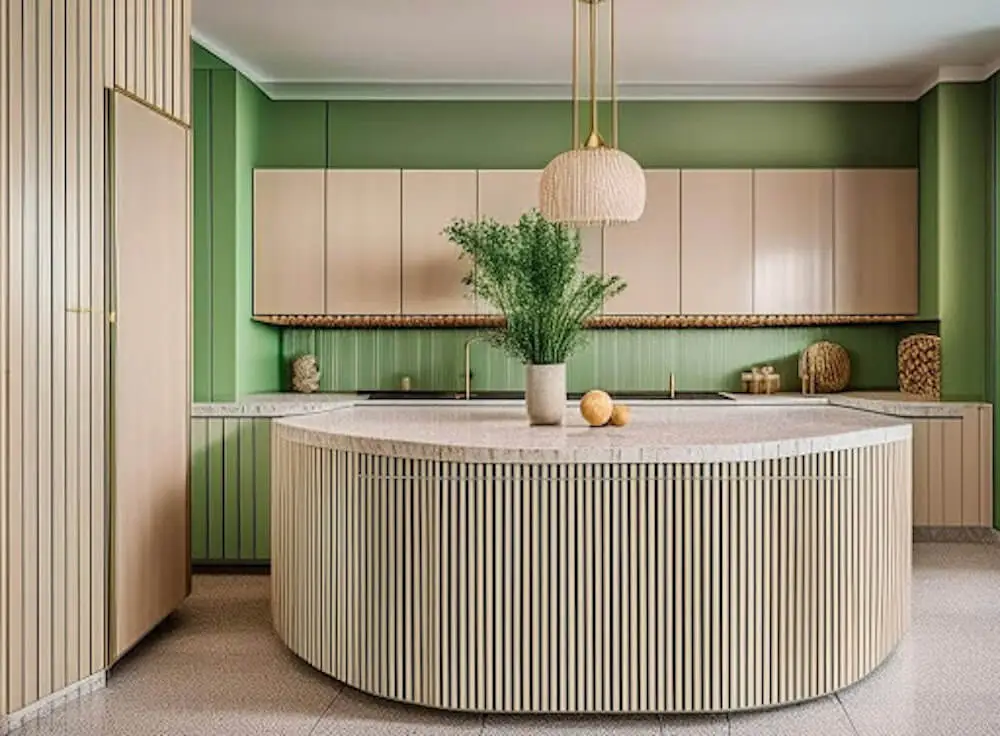Данный цвет и все его оттенки считается наиболее приятным для восприятия. В фен-шуй говорится о его благотворном влиянии как на душевное состояние, так и на самочувствие. Зеленый цвет, как и все его оттенки, от оливкового до изумрудного, ассоциируются с природной красотой и гармонией. Больше всего для кухни подойдут именно теплые тона: фисташковый, грушевый, цвет лайма, а также салатовый и оливковый.