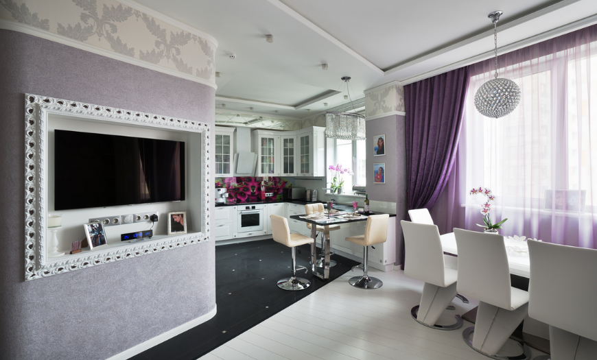 Фиолетовый. Необычный оттенок для оформления стен. Рекомендуется только для просторных комнат. Оттенки фиолетового (лиловые или лавандовые) способны подчеркнуть богатство убранства. Они создают особый, романтический настрой в помещении.