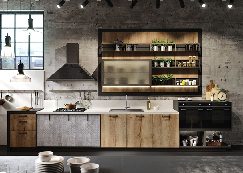 - В минимализме и дизайне эко облепиховый спектр может быть представлен натуральной древесиной — достаточной яркой и одновременно фактурной. Чтобы сделать кухонный гарнитур более легким и негромоздким, верх может быть решетчатым, стеклянным или вообще открытым. Открытые полки смотрятся более воздушными, даже в черно-сером исполнении, ведь это всего лишь линии, а не фасады. Черная окантовка полок проводит линии, которые определяют динамику интерьера.