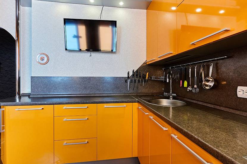 На кухне в стиле хай-тек можно установить лаконичный кухонный гарнитур с оранжевыми глянцевыми фасадами и стеклянными вставками. Стены в данном интерьере могут быть белыми или светло-серыми, в таком же цвете стоит обустроить и пол.