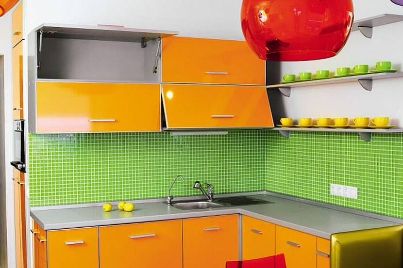 На фото — оранжевый гарнитур с открытыми верхними полками.