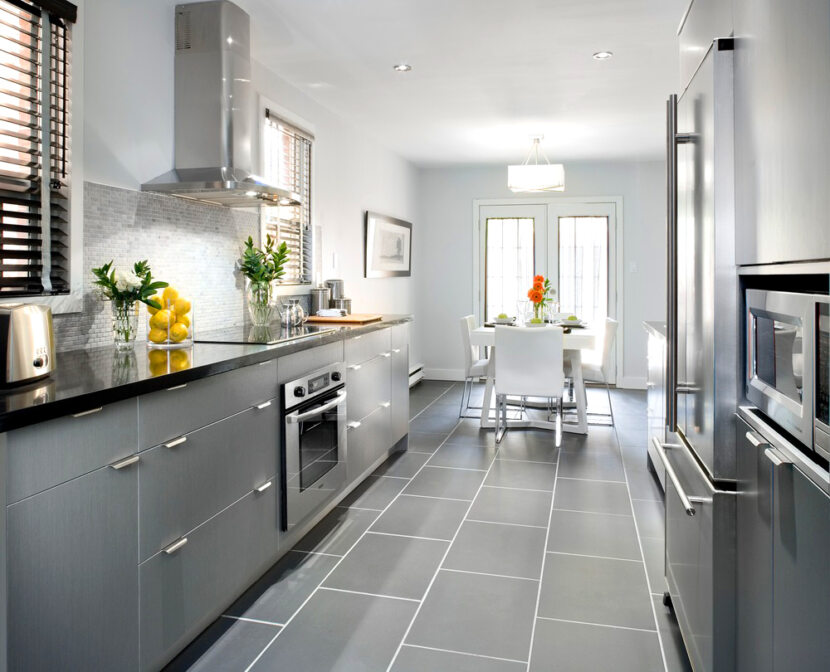 Кухонное помещение подвержено воздействию влаги, жира и другим загрязнениям, в сером цвете ее полы, плитка или обои на стенах, столешница и фасады мебели будут пачкаться не так заметно.