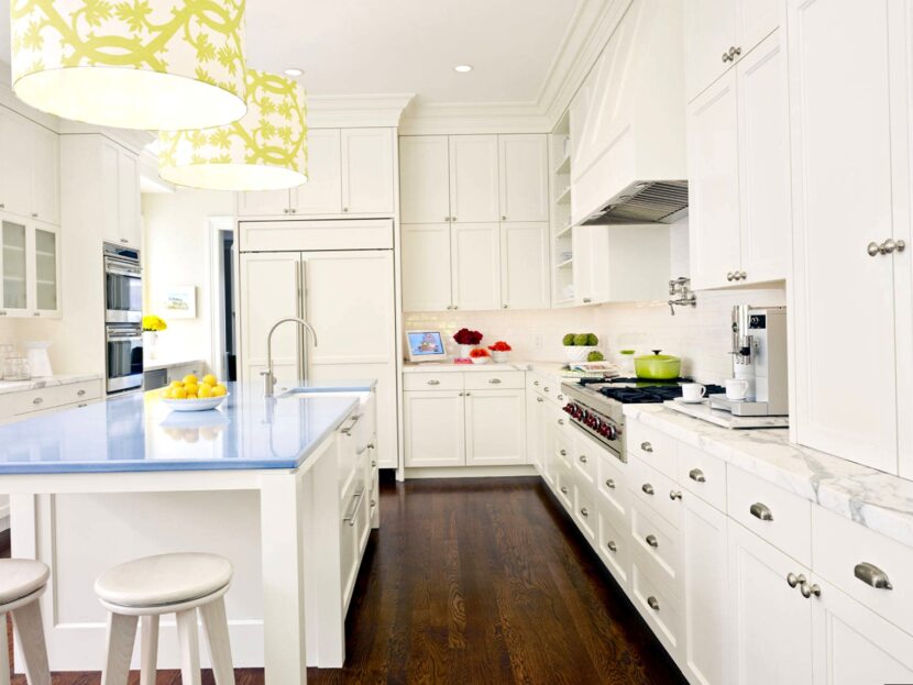 Синие отливы могут стать дополнением белого, молочного, серого. Не стоит выбирать темные оттенки в качестве фоновых, лучше добавьте синие нотки в текстиле, мебели на кухне.