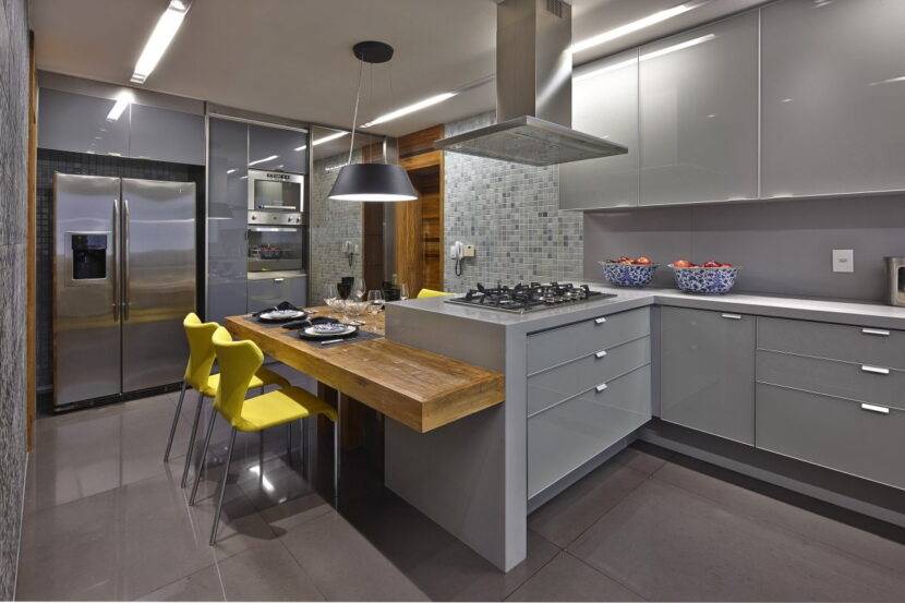 Чтобы кухня выглядела более изысканно и элегантно, стоит комбинировать серый цвет с коричневым, бордовым, черным, темно-фиолетовым, фисташковым. Если есть желание оживить интерьер, сделать его ярким и оригинальным, рекомендуется сочетать серый цвет с такими яркими оттенками, как оранжевый, розовый, салатовый, желтый, красный, синий.