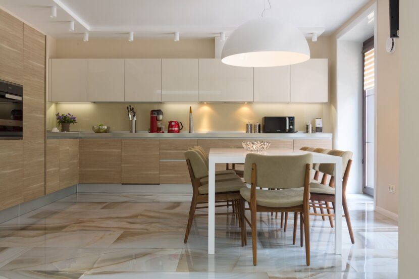 Для чего это нужно и как это поможет создать сочетание дерева в интерьере кухни? То есть, так мы размываем границу между цветом пола и цветом стола выделяющейся деталью. Таким образом, взгляд сосредоточен на ярком пятне, которое находится в центре