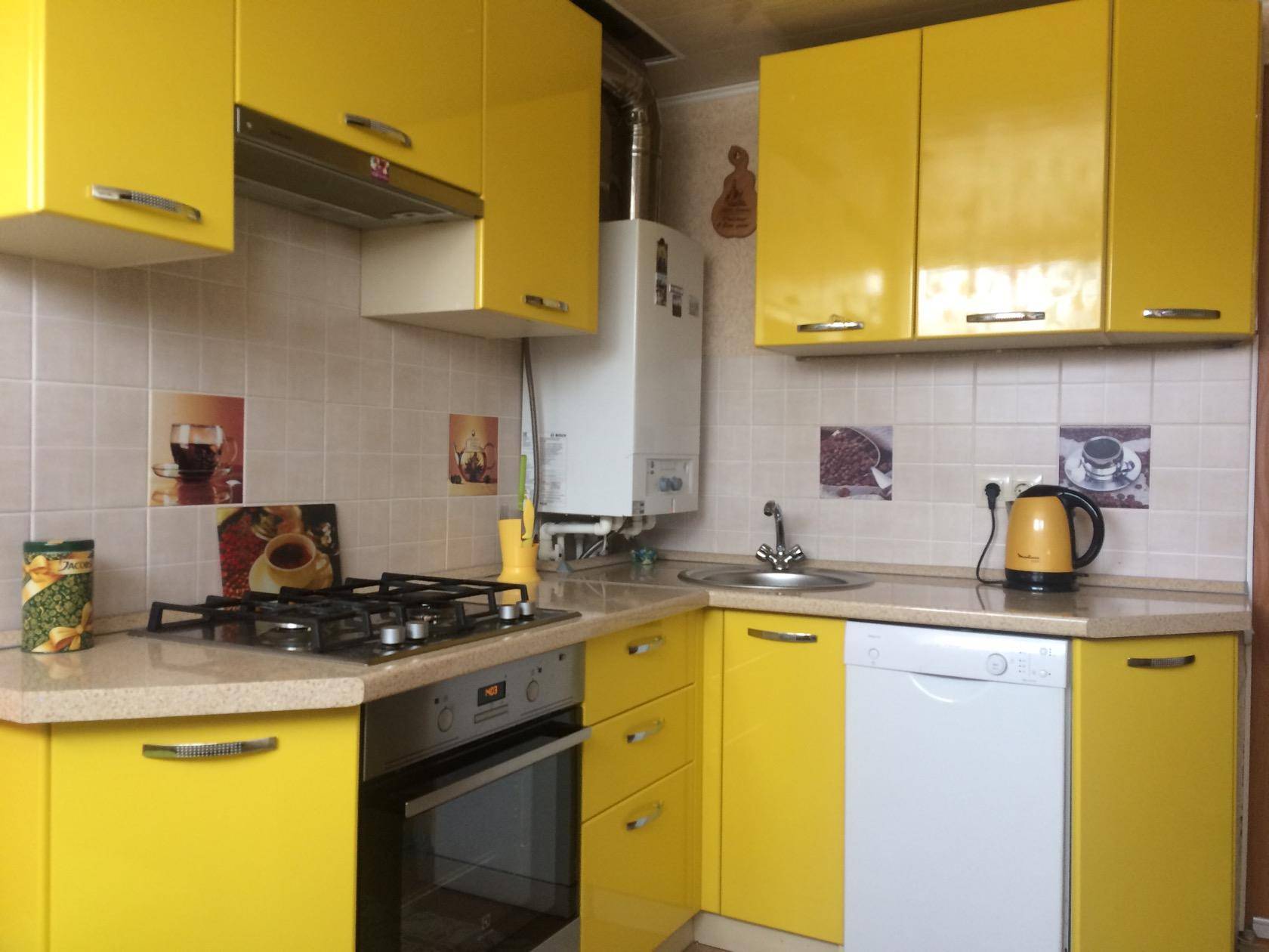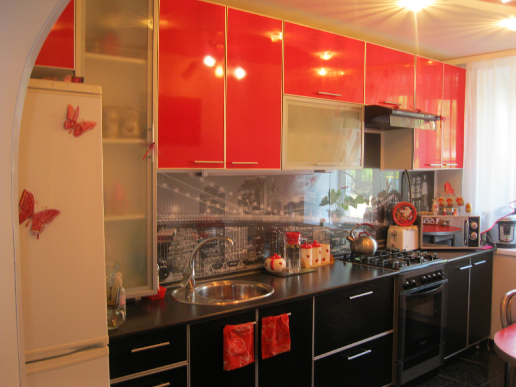 - в небольших кухнях для шкафов идеально подходят лакированные фасады, они доступны в различных цветах – от белого, до желтого, розового, зеленого и черного.
