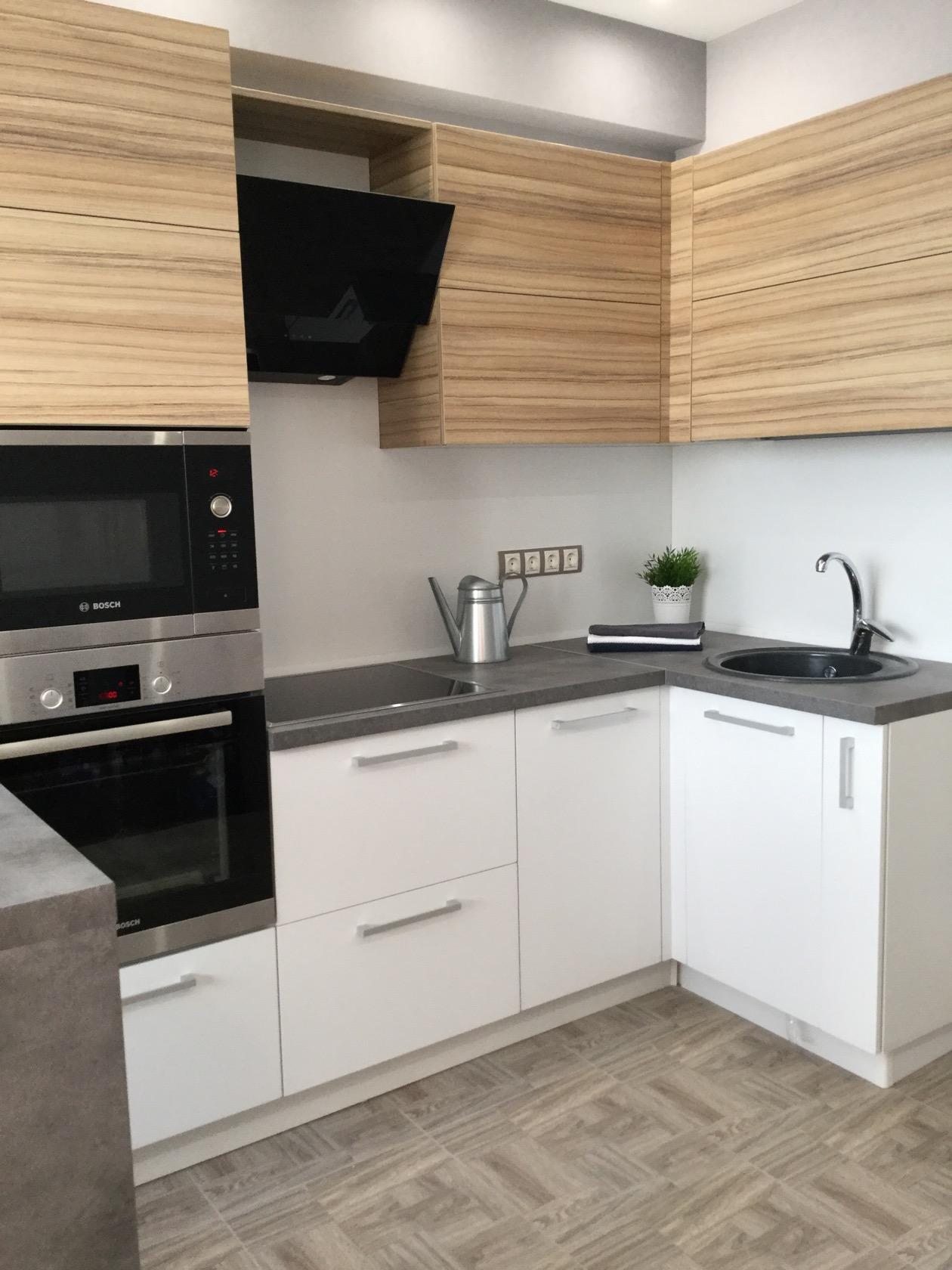 Визуально добавить объем в небольшом кухонном помещении можно за счет двух-, трехцветных фасадов. Часто это более темный низ и светлый контрастный верх. Дизайнеры проекта Dekorin подобрали для вас самые ходовые комбинации. Это: