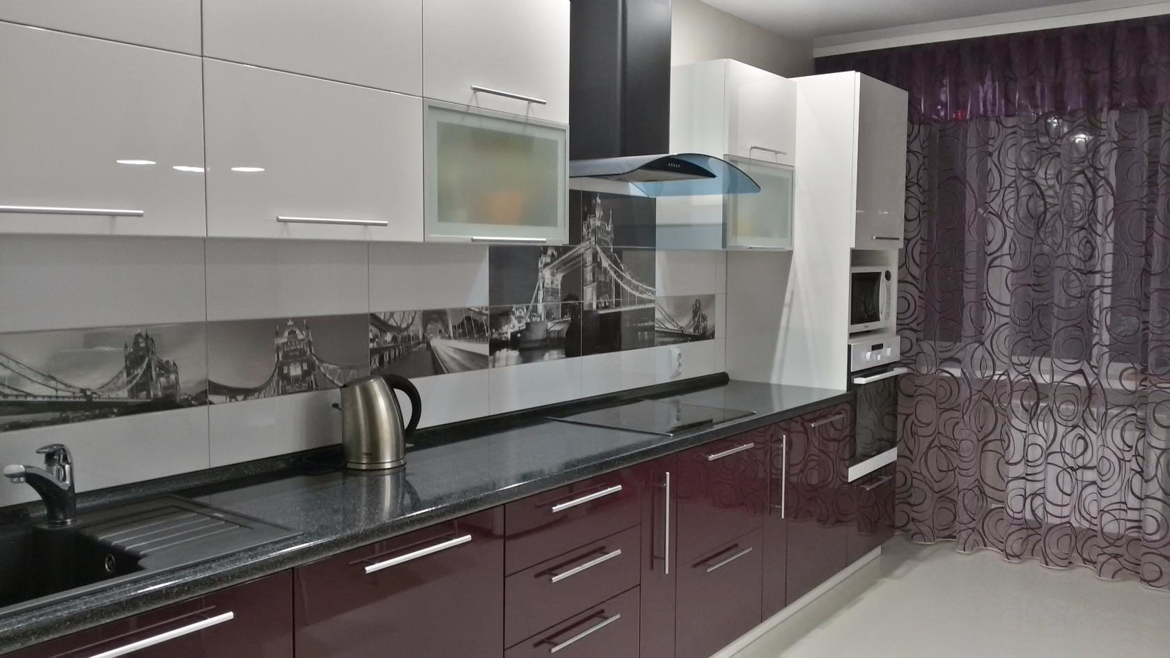 Очень оригинально и привлекательно будет выглядеть кухня в стиле хай-тек со светло-серыми стенами, серым полом из керамогранита, белым гарнитуром с глянцевыми фиолетовыми фасадами.