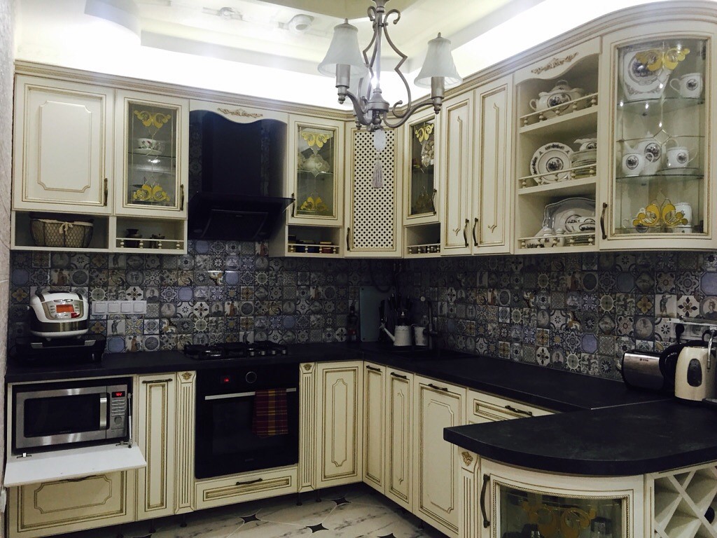 - Черный можно назвать очень смелым. Его можно использовать исключительно в кухнях больших площадей, а лучше всего, если им будут сделаны лишь некоторые фрагменты оформления, при этом фон будет белым. Такой вариант однозначно классичен, а также показывает отменный вкус хозяев.