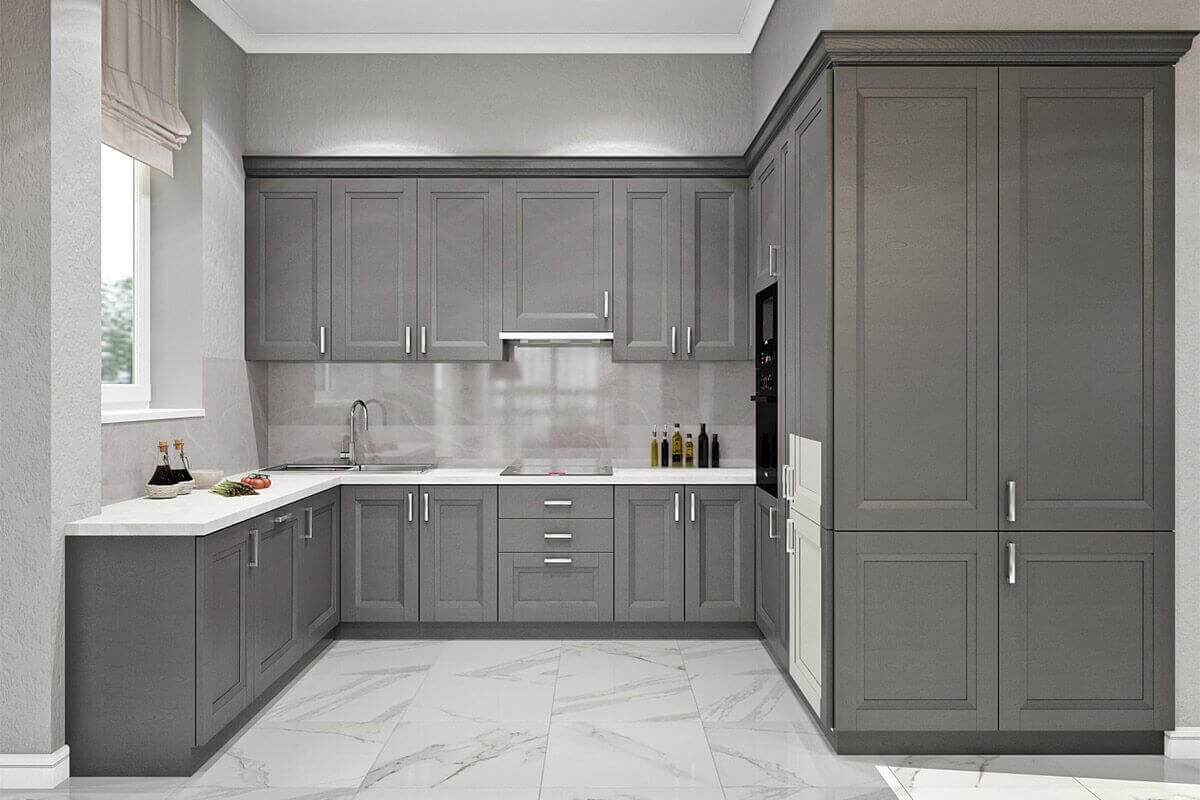 Тёмно-серые фасады кухонного гарнитура в сочетании с белой столешницей создадут эстетичный контраст