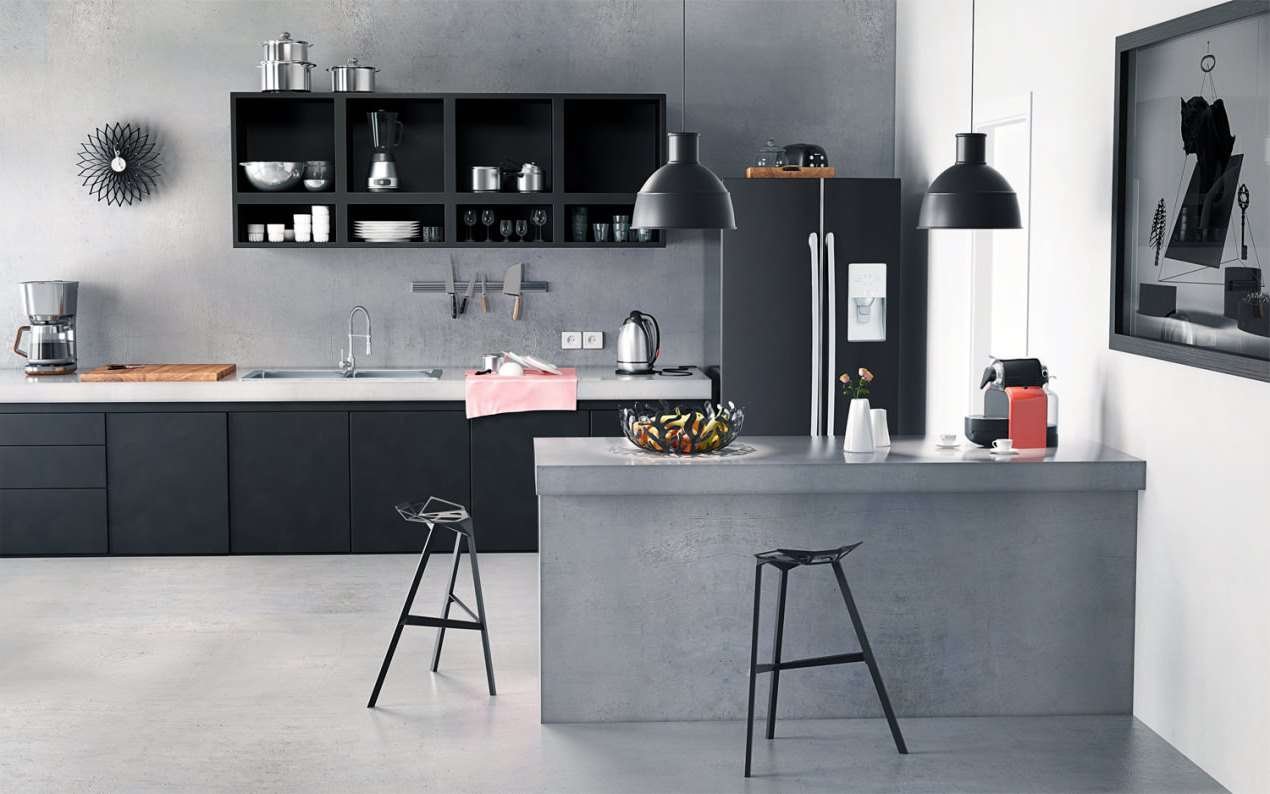 Лучшим фоном для тёмно-серого гарнитура станут светлые стены и наоборот.
