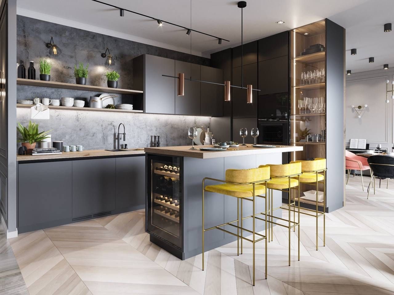 Черная столешница и цвета антрацит выглядит стильно. Подходит для кухни среднего размера и больше, визуально разделяет верхние пеналы и нижние шкафы гарнитура. Хорошо выглядит в любом стиле.