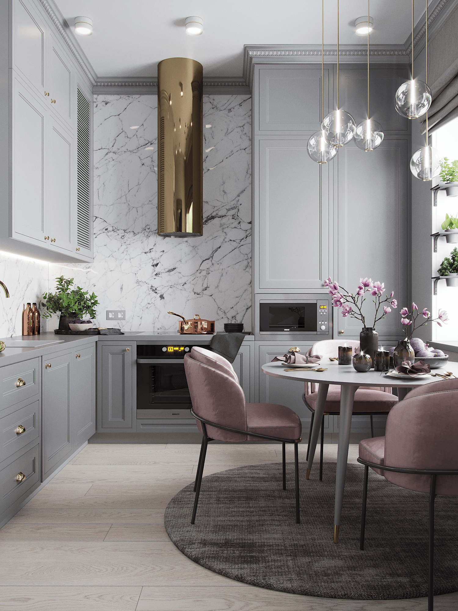 Отличный вариант для тех, кому больше нравятся спокойные интерьеры без каких-либо ярких включений. Серый в сочетании с нежными пастельными тонами создаст максимально плавные переходы цвета. Это смотрится очень красиво и гармонично.