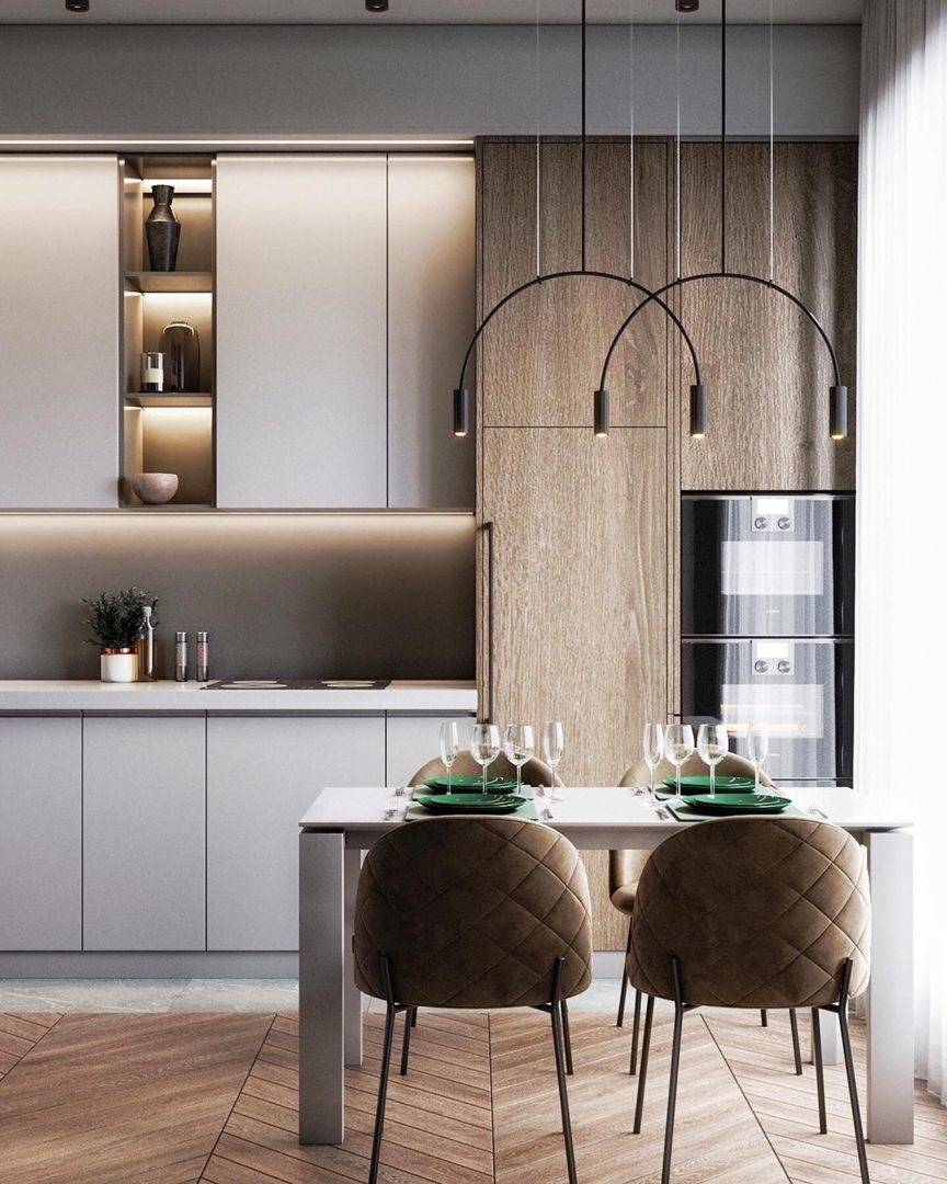 На серой кухне поверхности, изготовленные из натурального дерева или его качественной имитации, сделают по сути строгий аристократичный серый мягче, придадут кухне наиболее эффектный вид. Это может быть мебель обеденной группы, кухонный фартук или столешница.