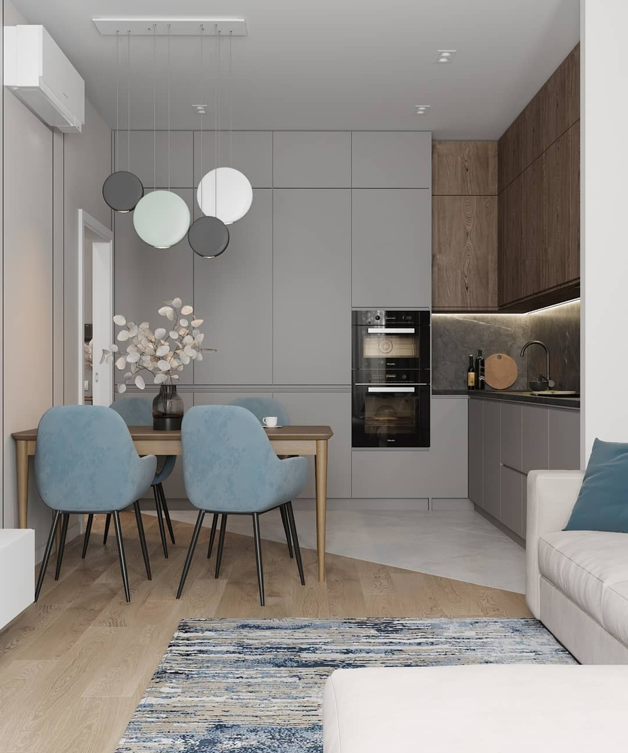 Синий и голубой так же как и серый относятся к холодной палитре. Даже если окна кухни выходят на солнечную сторону, и света в пространстве будет довольно много, такая палитра будет смотреться вполне уместно. Чтобы избежать безликости и скукоты в дизайне, можно использовать интересные фактуры, а также яркие акценты.
