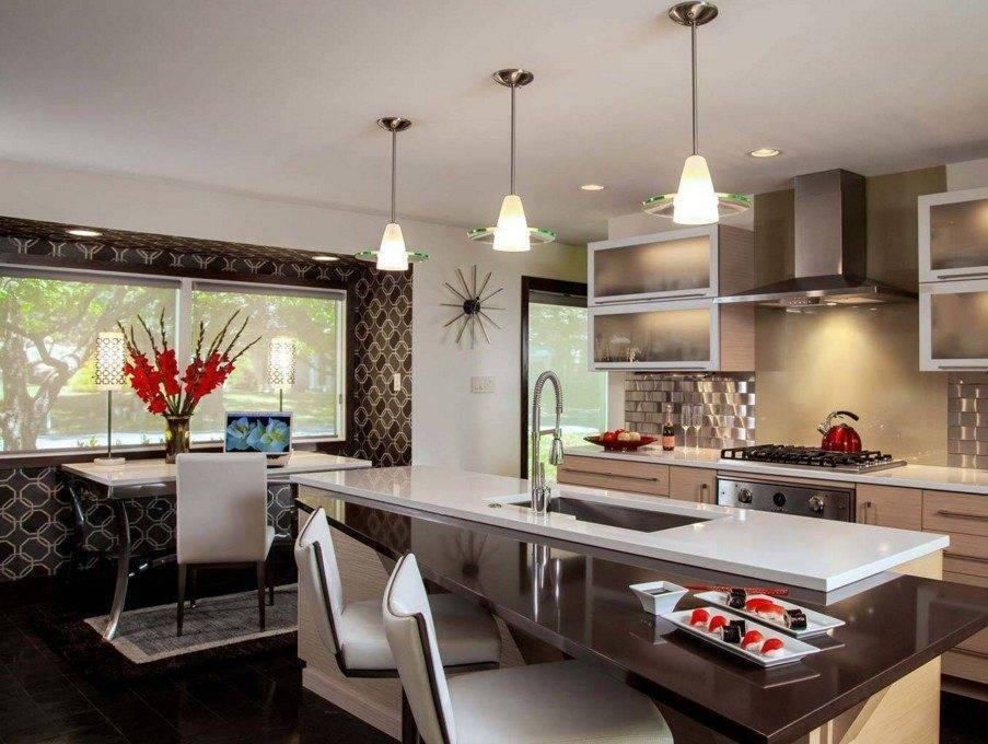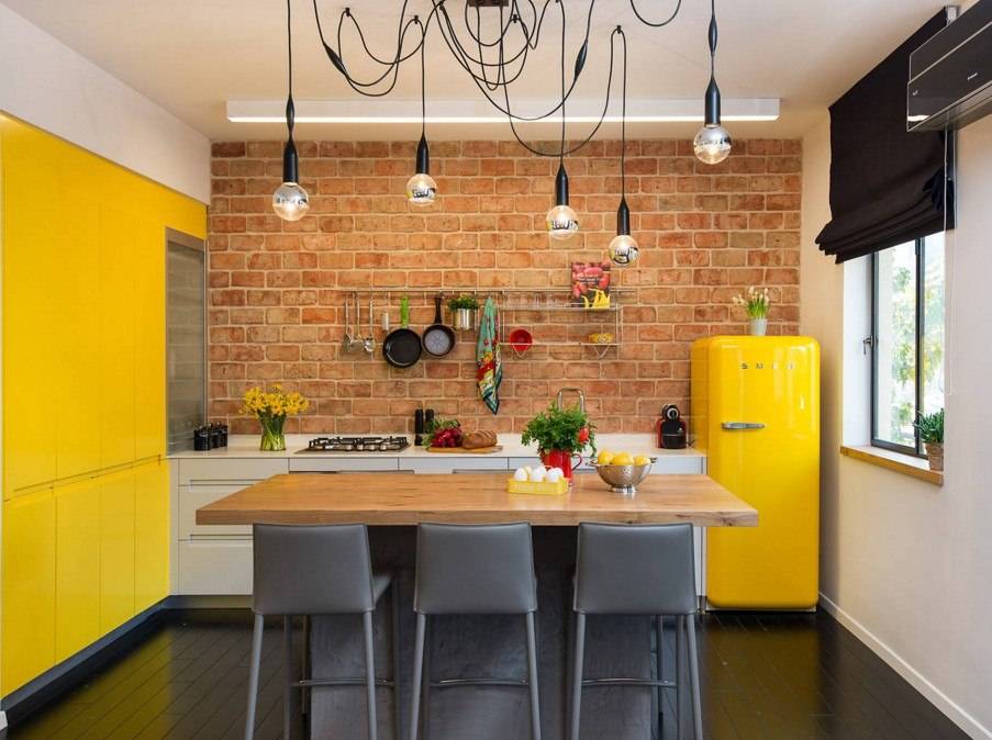 Современной кухне – современные материалы. Отделка любая: индустриальная кирпичная кладка лофта или обои – нужно лишь брать в расчет необходимость ухода (ровную поверхность проще протирать, нежели фактурную). Пол выложите плиткой, камнем или паркетной доской – все эти материалы ударопрочные, но в последнем случае в обязательном порядке должно быть влагоотталкивающее покрытие.