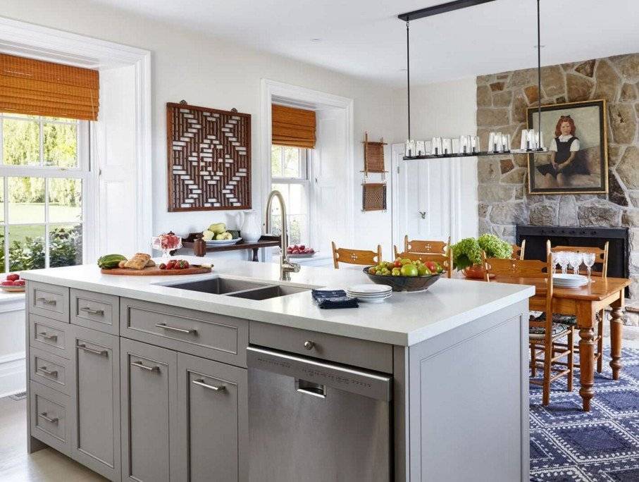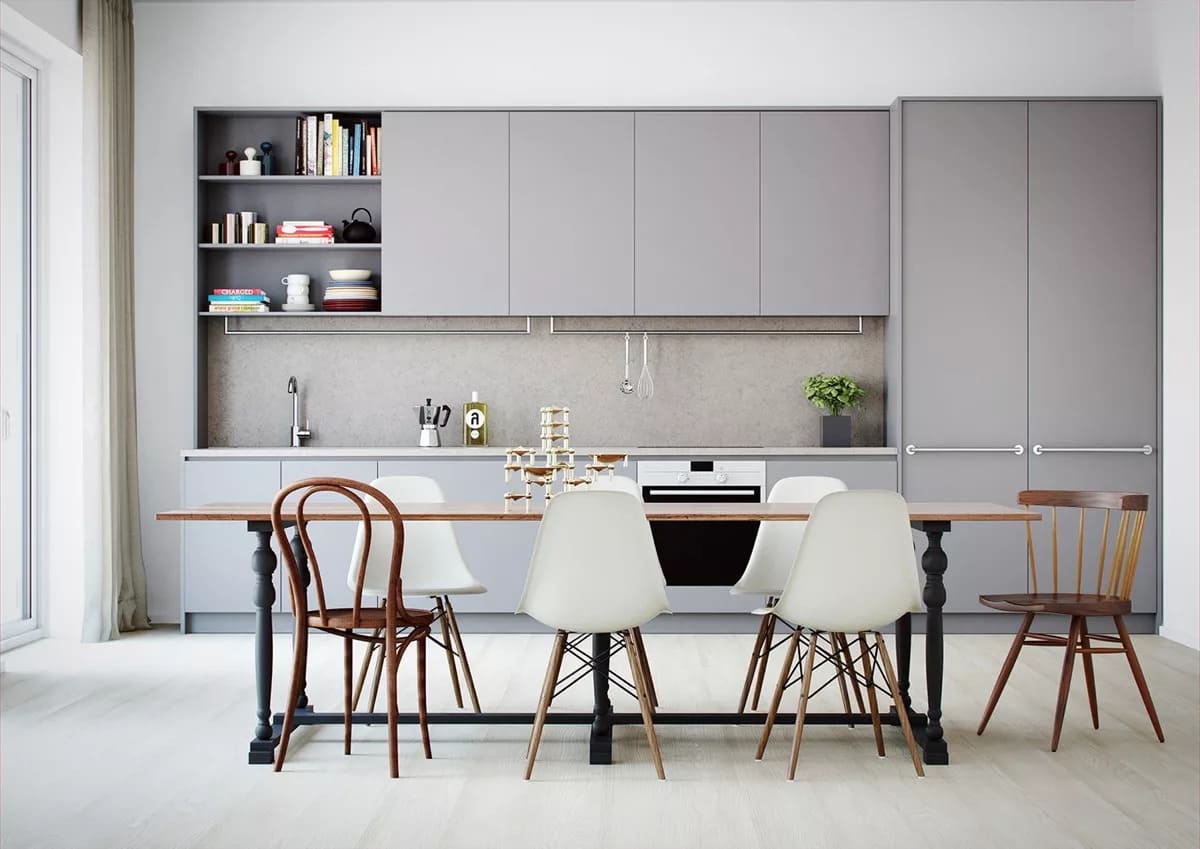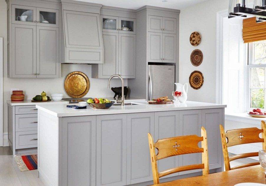 Элегантный и функциональный. Серая кухня выглядит элегантно, но в то же время свежо. В него можно положить любой гарнитур, столовую мебель, текстиль. Яркие оттенки не потеряются на сером фоне, но и не будут слишком кричащими. Серая основа украшает интерьер. Серый сочетается с белым, голубым, оливковым, коричневым и даже черным. Лучше выбирать ткани в тон, но с другой фактурой — глянцевые, металлик или хром.