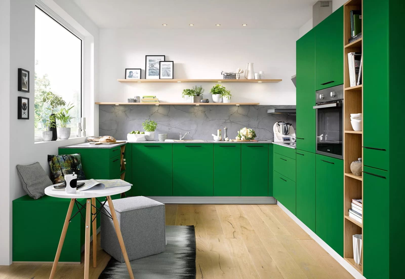Зеленый в чистом виде используется на кухне только в качестве акцентов. В качестве фона выберите теплый зеленый цвет или оттенок скошенной травы. Хорошо подойдет серая и зеленая цветовая гамма. Если кухня выполнена в светлых тонах, она будет сиять зеленой фактурой.