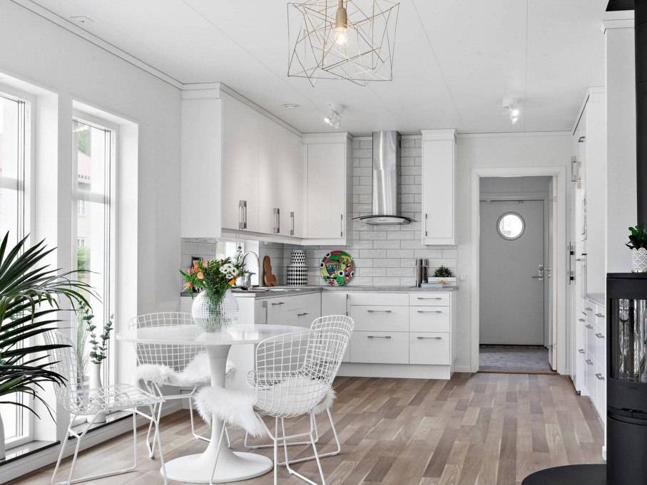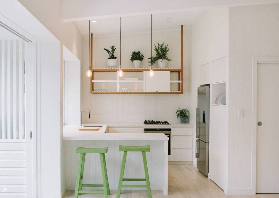Белая кухня строгая, но очень тихая и удобная. У него чистые линии и большое пространство. Белая кухня не выглядит скучной и однообразной — она очень яркая и активная. Вареная белая комната порадует и общим монооксидом, и яркими акцентами. Дерево и металл светлых оттенков сочетаются с белым.