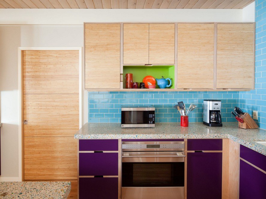 • Уместной станет контрастная мебель, наличие столешниц в нежных, пастельных расцветках.