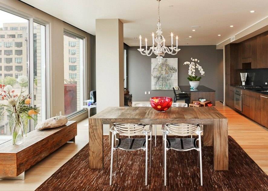- Идите от большого к маленькому. Если вы планируете оформить декор акцентной стены (в обеденной зоне, например) и хотите сделать его броским и массивным, не забудьте добавить маленькие детали в прочую обстановку. Допустим, что вы захотели украсить стену сосновым спилом, тогда полки рабочие поверхности и даже посуда должна вторить выбранному акценту и создавать гармоничный и целостный антураж.