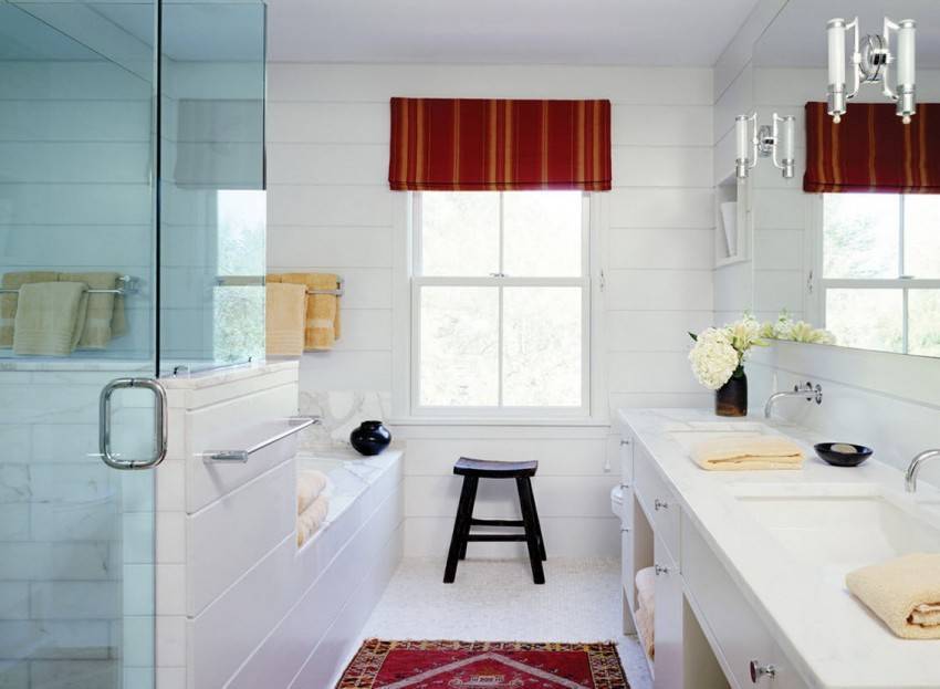 Те, кто не боится быть ярким и оригинальным, могут выбрать ванную, оформленную с использованием красных оттенков. При этом преобладает белая плитка, матовые поверхности душевой кабины