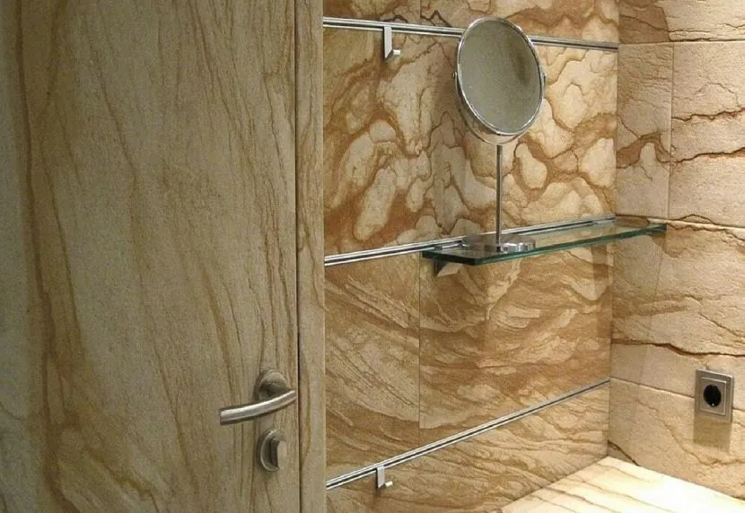 В ванной каменный композит приклеивают к перегородкам фиксирующим составом. Положение материала можно корректировать в течение 5 минут, после чего детали схватываются. Отделка очень легкая, поэтому элементы не сползают во время монтажа.